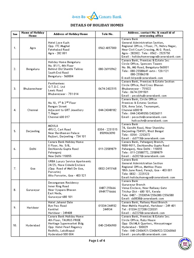 Non Toll Free Numbers if calling from outside India 91-80-22064232. Marys Campus East Veli Street Madurai - 625 001 Tele. Mahabaleshwar Canara Bank Holiday Home Hotel Stone House Behind Shanti Villa Vishnu Cottage Malcom Path Near Bus Stand Mahabaleshwar-412806.
